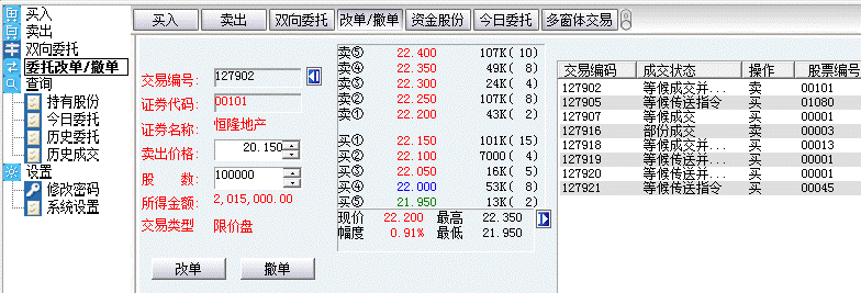 新版的下单客户端已增加《买入》《卖出》《撤单》《改单》《资金股份》等功能按钮放在窗口顶行,方便用户直接点击快速切换,而不需要再点击左侧的菜单栏目,见下图: