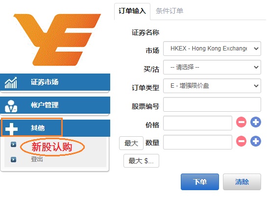 登入网上股票交易平台 (https://trade.yxsh.hk/mts.web/Web2/login/yxs/index.html#big5) 从目录点开「其他」后,点击「新股认购」。